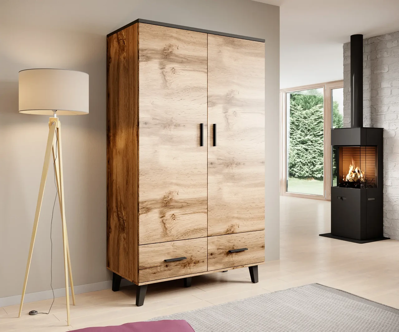 Шафа 2D2S Лотта Кама містить два висувні ящики та одне закрите відділення з штангою для вішалок всередині.
